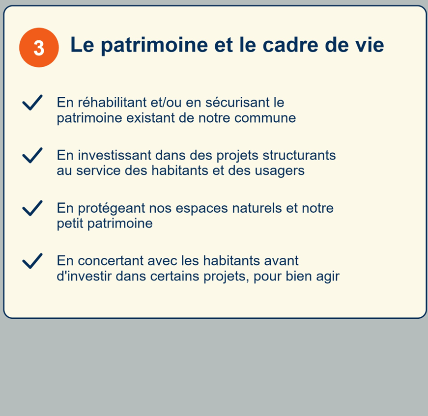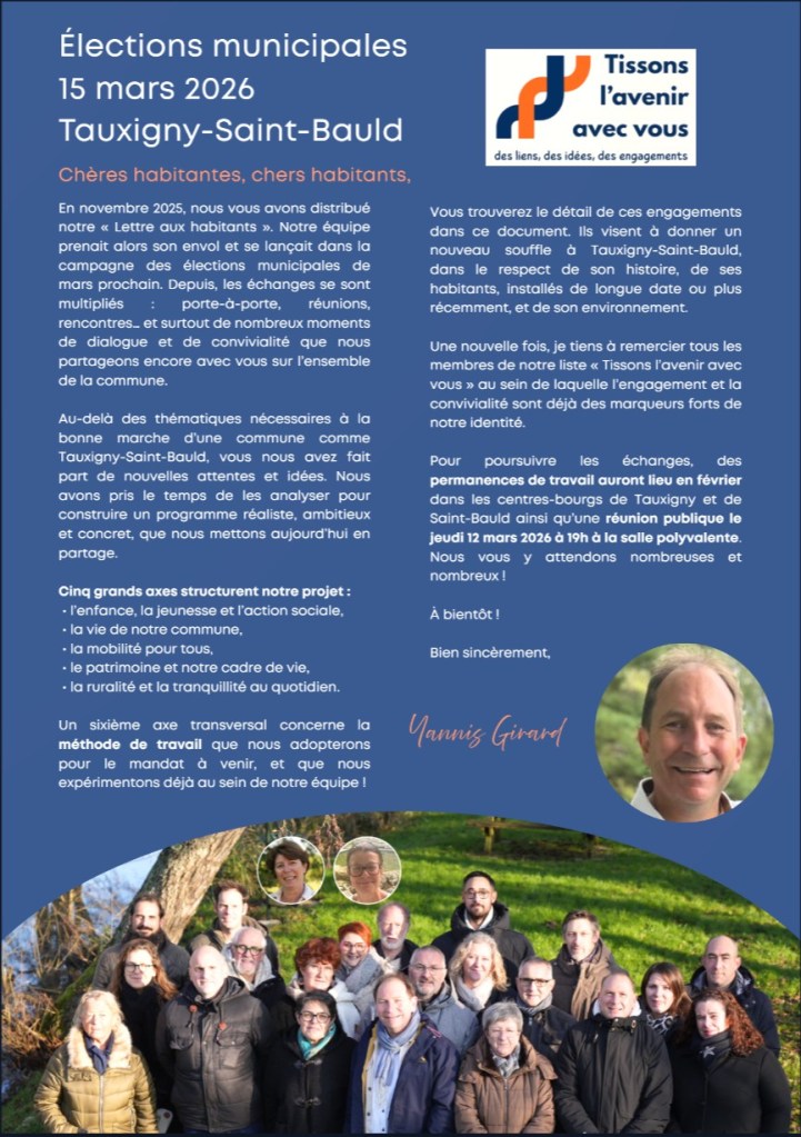 Tout en préservant l’héritage des mandatures précédentes, et avec une approche responsable, ces valeurs vont guider notre action pour donner un nouveau souffle à notre commune, construire un nouveau dialogue avec nos concitoyens, y compris par la démocratie participative, leur apporter de nouvelles idées et mettre en œuvre de nouveaux projets pour leur bien-être et le plaisir qu’ils ont de vivre à Tauxigny-Saint-Bauld et sur le territoire de la communauté de communes Loches Sud Touraine.